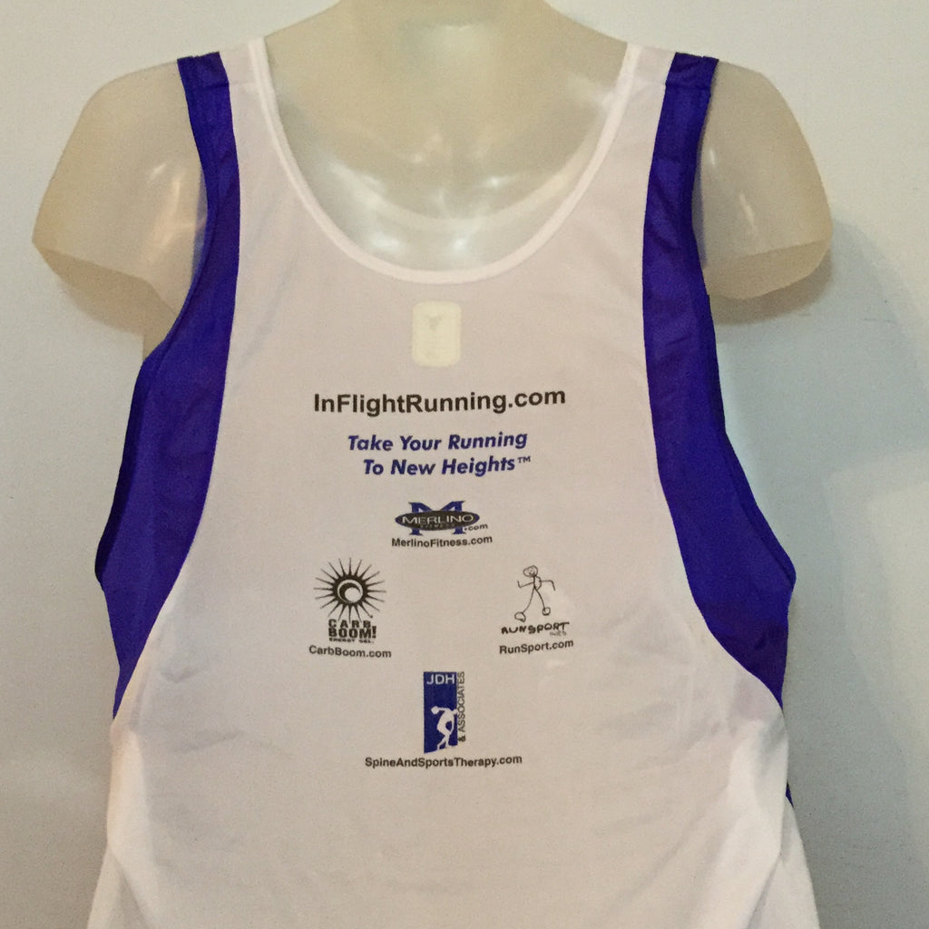 Insport white tank with blue side accents and the old In Flight logo on the front and team sponsors printed on the back.