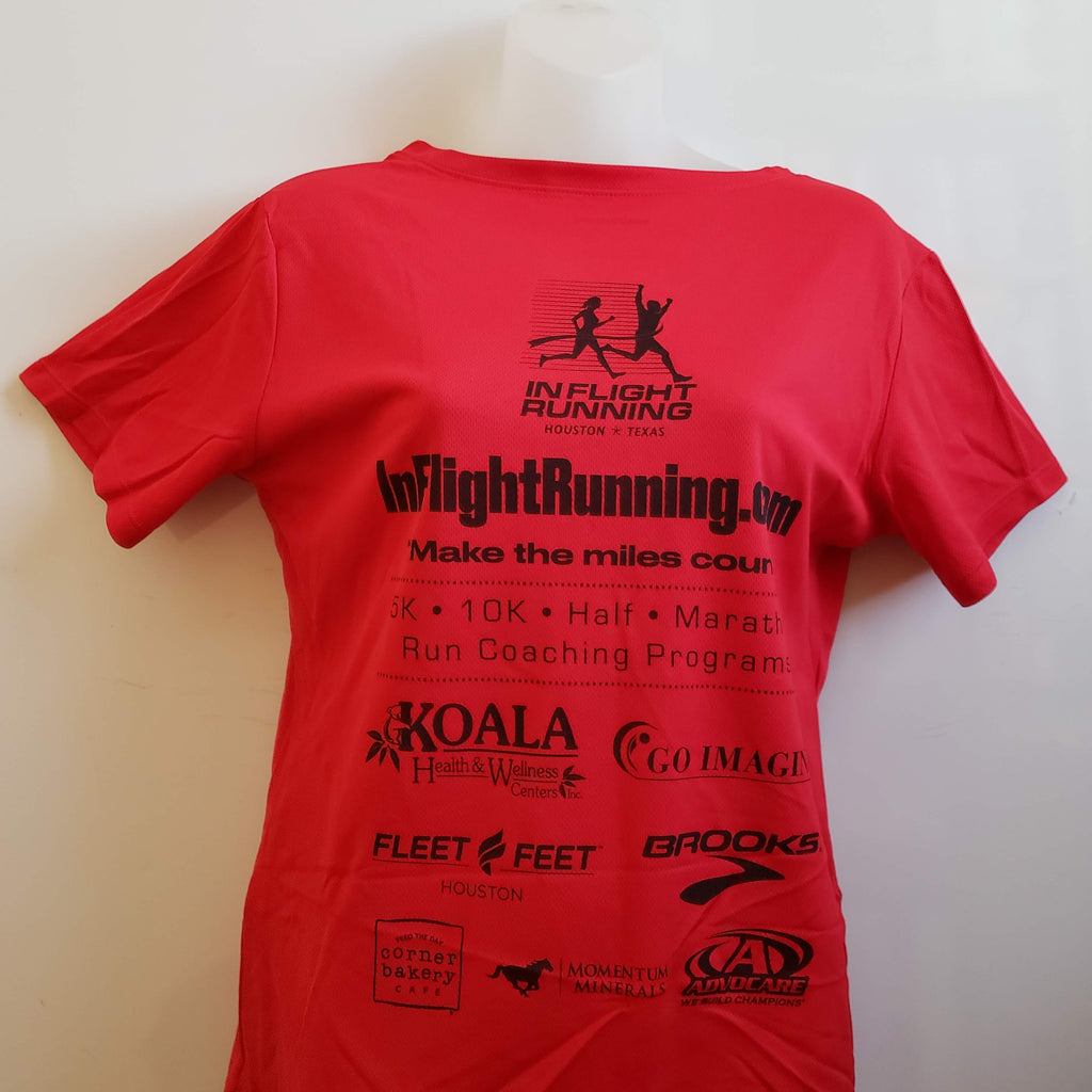 This bright cardinal red shirt includes an outline of the state of Texas and a silhouette of the Houston skyline on the top. Race medal is featured on the left with "Make the miles count!" In Flight Running tag line on the bottom. IFR logo, tagline, website address & team sponsors are printed on the back.